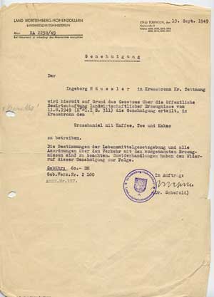 Gründung des Unternehmens am Bodensee unter der Bezeichnung „Ingeborg Häußler Kressbronn“. Am 19. September Erteilung der Genehmigung durch das damalige Land Württemberg-Hohenzollern für den Großhandel mit Tee, Kakao und Kaffee. Die ersten Teebeutel werden aus Verbandsmull hergestellt. Der Mull wird mehrlagig ausgelegt und sechseckig ausgeschnitten. Mit Apothekerwaagen wird der Tee eingewogen. Die Fäden werden in Heimarbeit an die Etiketten angeklebt und mit einem Aluminiumkäppchen und einer Zange für Paketplomben an die Teebeutel verplombt. Der Versuch, Kaffee ebenfalls portioniert in Einzelbeuteln zu verpacken und zu verkaufen, scheitert. Der Kaffee verliert an der Luft schnell sein Aroma. Ingeborg Sauter konzentriert sich auf den Tee.