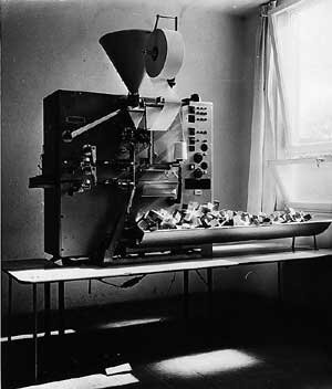 Nach mehrjähriger Entwicklungszeit: Verkauf unserer ersten Teebeutelmaschine mit Knoten statt Metallklammer am Teebeutel. Besonders zu erwähnen ist, daß fast alle bestehenden Teebeutelmaschinen aus unserem Haus nachgerüstet werden können. Dadurch haben unsere Maschinenkunden einen hohen Investitionsschutz erhalten. Ein weiterer Vorteil unseres Knotens: Der Beutel kann nicht abreißen, wenn man am Faden zieht, denn der Knoten besteht aus selbstumschlingenden Schlaufen.